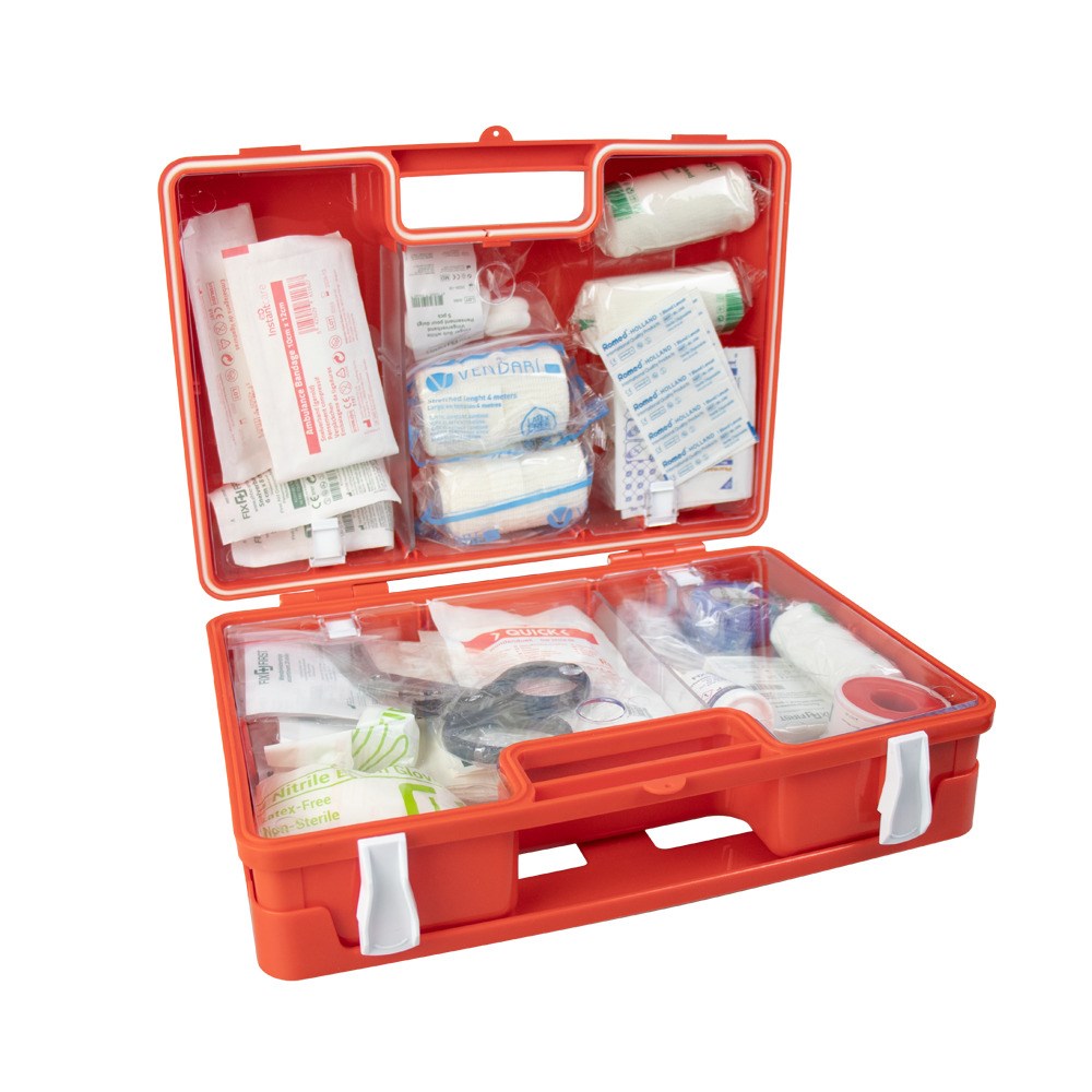 De Verbanddoos BHV is geschikt voor verschillende soorten bedrijven en zo ingericht dat er bij verschillende soorten ongevallen direct eerste hulp kan worden verleend. Door het etiket heeft u al een indicatie van de inhoud zonder de verbanddoos daadwerkelijk te openen. De inhoud is afgestemd op verschillende ongevallen die tijdens meerdere werksituaties plaats kunnen vinden. Onze BHV-koffer is goedgekeurd door Het Oranje Kruis (VA 73-54)Dat betekent dat het Oranje Kruis garant staat voor de kwaliteit. De BHV-trommel voldoet uiteraard aan de nieuwste richtlijnen van 2021. De interne BHV organisatie wordt getraind in het gebruik van deze middelen volgens de nieuwe richtlijn.