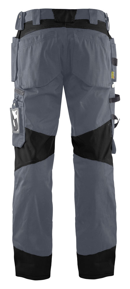 • Twee achterzakken met plooi en hamerlus, een versterkte duimstokzak, pennenzak en meshouder.