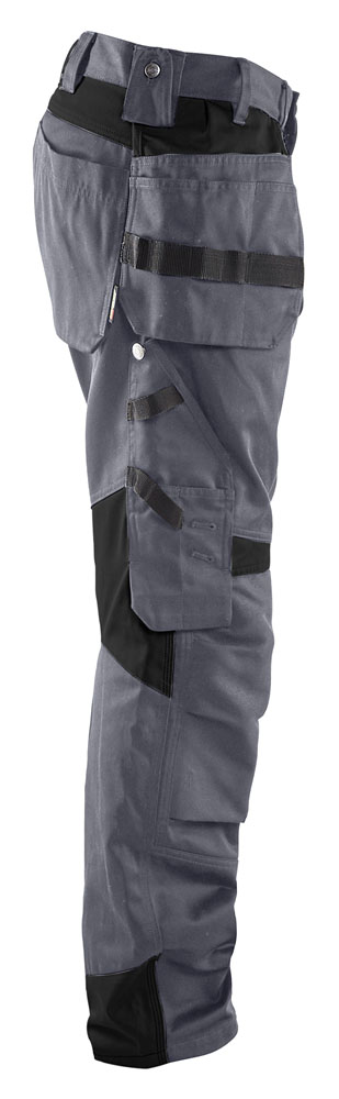 • Twee achterzakken met plooi en hamerlus, een versterkte duimstokzak, pennenzak en meshouder.