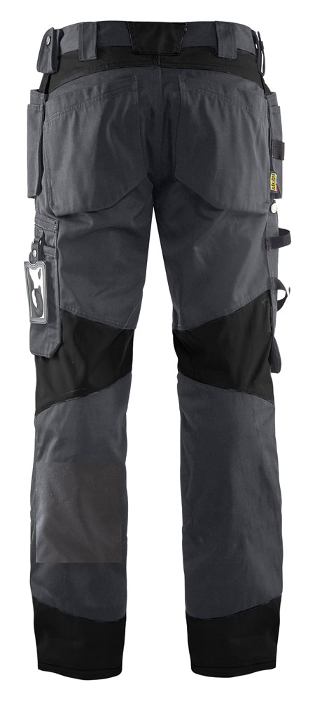 • Twee achterzakken met plooi en hamerlus, een versterkte duimstokzak, pennenzak en meshouder.