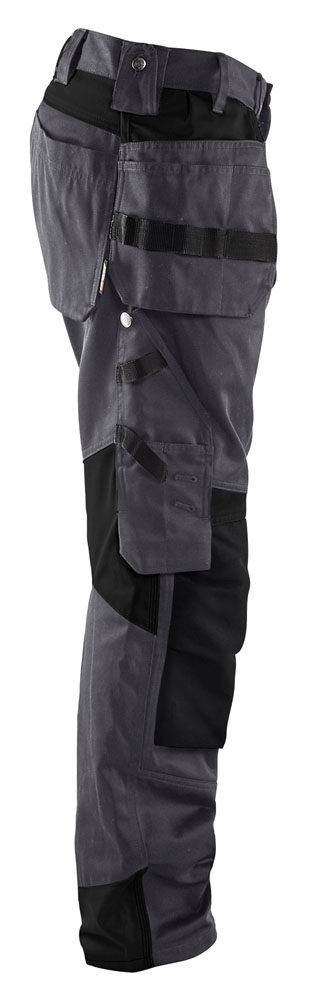 • De broek heeft ook twee achterzakken, een lus voor een hamerhouder, een versterkte duimstokzak, pennenzak en messenhouder.