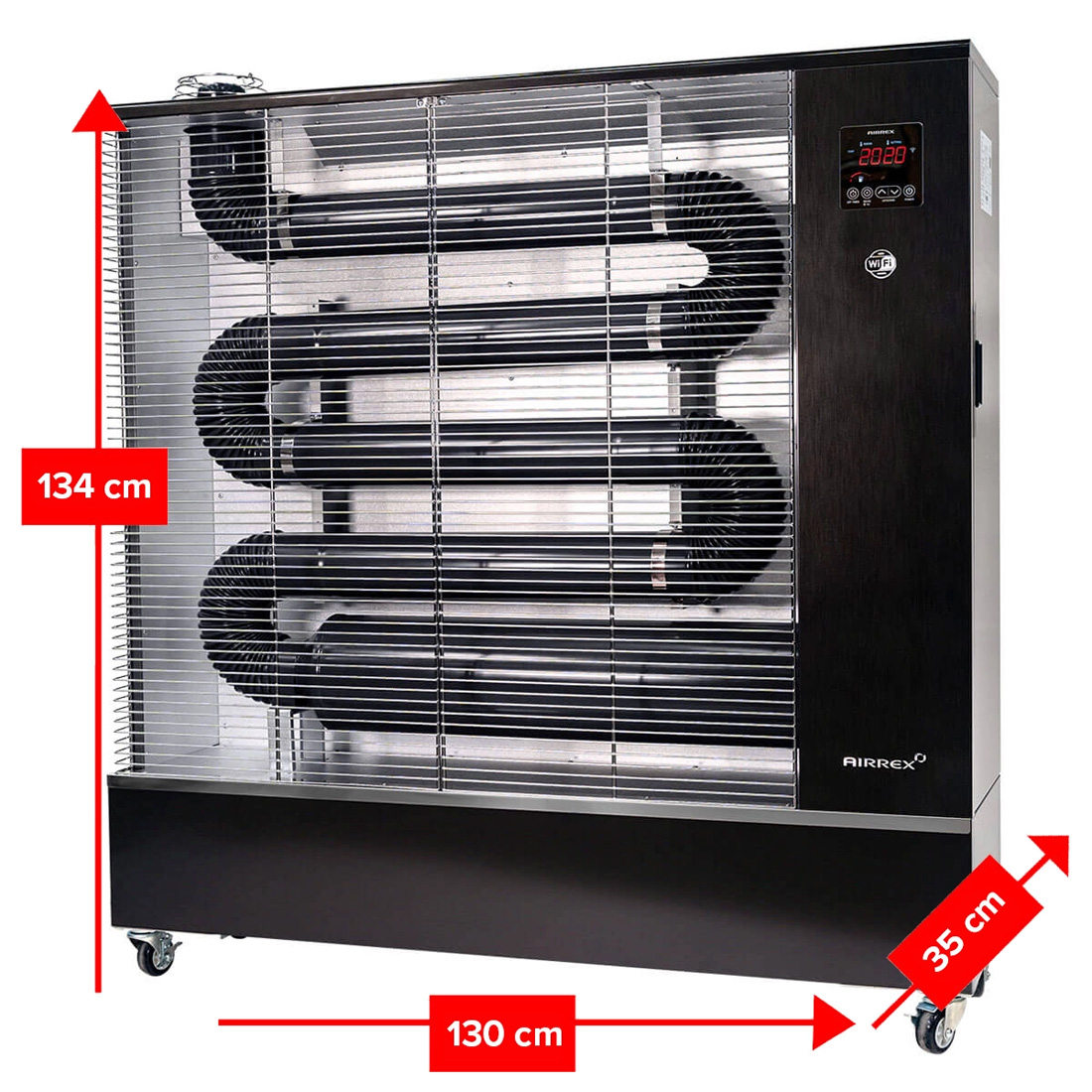 De Airrex AH-800i is een krachtige 22 kW diesel-infraroodkachel ontworpen voor zeer grote ruimtes tot 2000m³, waardoor hij ideaal is voor industriële magazijnen, productielocaties, grote bouwplaatsen en zware commerciële toepassingen. Dit robuuste industriële apparaat werkt op hernieuwbare diesel (HVO), standaard diesel of rode diesel met een brandstofverbruik van 1,71 tot 1,9 liter per uur tijdens continue verwarming, hoewel de automatische thermostaat het werkelijke verbruik aanzienlijk vermindert bij praktisch gebruik, terwijl de grote 70-liter brandstoftank zorgt voor langdurige werking voor de meest veeleisende toepassingen.
